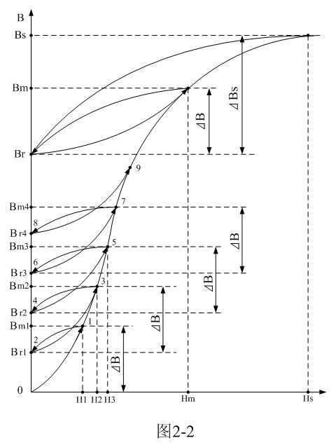經(jīng)過n個(gè)直流脈沖電壓之后,變壓器鐵芯中的最大磁通密度Bm和剩余磁通密度Br才能基本穩(wěn)定在某個(gè)數(shù)值之上,即:脈沖序列的作用達(dá)到穩(wěn)定狀態(tài)后,磁化過程將沿原始曲線上某一固定局部磁滯回線n點(diǎn)重復(fù);這時(shí)剩余磁通密度為Br n(Br n= Br),磁通密度變化無論磁場強(qiáng)度增長或降低,其ΔB值基本不變。