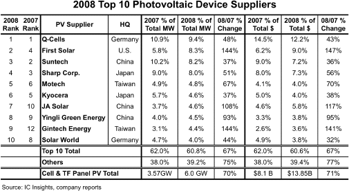 供應(yīng)量位居第三的是上年排名第二的尚德太陽能電力有限公司(Suntech Power Holdings),上年排名第三的夏普以與尚德的0.2個百分點之差下滑至第四。不過,在銷售額方面夏普位居第三,尚德以0.1個百分點之差退居第四。IC Insights評價夏普的薄膜硅太陽能電池增產(chǎn)及擴大銷售的計劃“很有野心”,并預(yù)測如果按照計劃推進(jìn),夏普將有望盡快奪回市場份額。