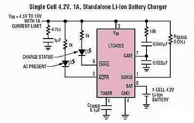 LTC4052需要一個電流受限的墻上適配器,以控制充電電流的大小。它還需配備過流保護電路,以便在意外使用較高電流或墻上適配器發生故障時能提供保護。LTC4052是一款全集成的脈沖充電器,無需使用外部MOSFET或阻流二極管(見圖3)。這款獨立的充電器IC具有C/10檢測、充電狀態指示、充電結束定時器、墻上適配器檢測及過流保護等功能。LTC4052的輸入電源可以是4.5V到12V,并具有1%的飄移電壓精度。