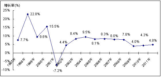 圖8 中國UPS市場1997-2011年市場銷售額增長率及預(yù)測