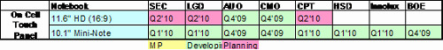 隨著Windows 7推出與對未來市場影響力,2010年多數(shù)面板廠商針對Notebook PC市場積極開發(fā)具觸控功能11.6寸寬螢?zāi)幻姘澹瑫r(shí)每一家生產(chǎn)迷你筆電面板廠商也都開發(fā)具有觸控功能面板。從下表一可以清楚了解每一廠商開發(fā)具觸控功能Notebook PC或迷你筆電面板時(shí)間表。