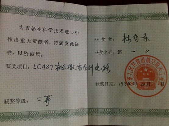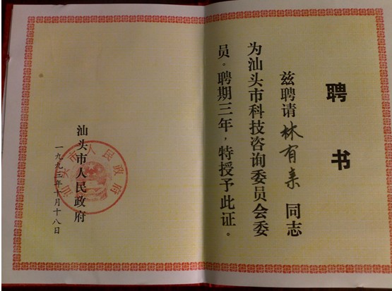 林有親先生的榮譽(yù)證書
