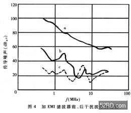 EMI濾波器能有效抑制單片開關電源的電磁干擾。圖4中曲線a為不加EMI濾波器時開關電源上0.15MHz~30MHz傳導噪聲的波形(即電磁干擾峰值包絡線)。曲線b是插入如圖3(d)所示EMI濾波器后的波形,能將電磁干擾衰減50dBμV~70dBμV。顯然,這種EMI濾波器的效果更佳。[page]