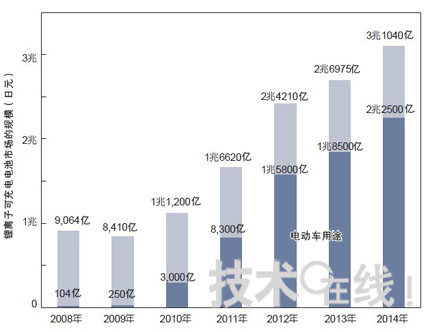 電動汽車鋰離子充電電池的市場在2014年預期會超過兩萬億日元,而整體的電池市場將超過3萬億日元。圖表是NikkeiElectronics依FujiKeizai提供的資料制成。