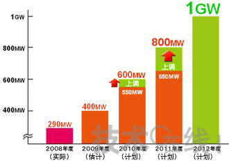 生產計劃方面,原計劃2010年度產量為550MW,2011年度為650MW。此次將其分別上調至600MW和800MW。另外,力爭2012年度產量達到1GW。以應對日本國內住宅用途及海外大型項目的不斷增加。另外09年度的產量估計為400MW。