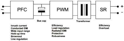 脈寬調(diào)制級(jí)(PWM)是主要的轉(zhuǎn)換器級(jí)。其中DC電壓被斬波為更高頻率的方波,因此利用更小的變壓器就可以轉(zhuǎn)換到另一個(gè)電壓級(jí)并提供隔離。并非所有的拓?fù)涠疾捎谜伎毡茸兓姆讲ǎ行┩負(fù)洳捎玫氖亲冾l,還有的則是改變兩個(gè)脈沖序列之間的相位。這一級(jí)主要確定轉(zhuǎn)換器的效率和負(fù)載調(diào)節(jié)。轉(zhuǎn)換器效率十分重要,首先它關(guān)系電源的運(yùn)行成本;其次是必須通過機(jī)箱冷卻來散除產(chǎn)生的熱量;第三是熱組件越大,就越昂貴,占用空間也越大。這三個(gè)因素與電源的使用壽命成本關(guān)系重大。