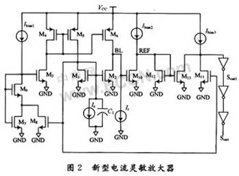 靈敏放大器的工作目的是通過放大位線上微小信號的變化而讀取存儲單元中的數據。一般可以分為電流型靈敏放大器和電壓型靈敏放大器兩種。由于電流靈敏放大器直接探測輸入電流的變化,可以克服電壓型靈敏放大器速度較慢、低工作電壓下小信號電壓增益減少等缺陷,因此電流靈敏放大器受到越來越多的關注。