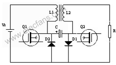 功率雙向流動(dòng)CUK變換器(圖2)與傳統(tǒng)的單向功率流動(dòng)CUK變換器不同的是:在原來(lái)開(kāi)關(guān)管Q1和二極管D1兩端分別反向并聯(lián)二極管D2和開(kāi)關(guān)管Q2如圖3所示。這個(gè)電路具有對(duì)稱性,輸入輸出電流方向可正可負(fù)。右邊負(fù)載R換為下正上負(fù)電壓源Vs,左邊電壓源Vs換為負(fù)載R,則功率從右向左倒流[2]。