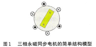 三相混合式步進(jìn)電機(jī)的工作原理十分類似于永磁同步伺服電機(jī)。其轉(zhuǎn)子上所用永磁磁鐵同樣是具有高磁密特性的稀土永磁材料,所以在轉(zhuǎn)子上產(chǎn)生的感應(yīng)電流對(duì)轉(zhuǎn)子磁場(chǎng)的影響可忽略不計(jì)。在結(jié)構(gòu)上,它相當(dāng)于一種多極對(duì)數(shù)的交流永磁同步電機(jī)。由于輸入是三相正弦電流,因此產(chǎn)生的空間磁場(chǎng)呈圓形分布,而且可以用永磁式同步電機(jī)的結(jié)構(gòu)模型(見(jiàn)圖1)分析三相混合式步進(jìn)電機(jī)的轉(zhuǎn)矩特性。為便于分析,可做如下假設(shè):