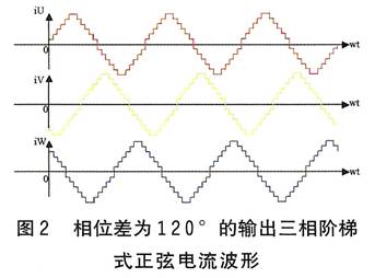 以上分析表明,對(duì)于三相永磁同步電機(jī),當(dāng)三相繞組輸入三相對(duì)稱的正弦電流時(shí),由于在內(nèi)部產(chǎn)生圓形旋轉(zhuǎn)磁場(chǎng),電機(jī)的輸出轉(zhuǎn)矩為恒值。因此,將交流伺服控制原理應(yīng)用到三相混合式步進(jìn)電機(jī)驅(qū)動(dòng)系統(tǒng)中,輸入的220V交流,經(jīng)整流后變?yōu)橹绷鳎俳?jīng)脈寬調(diào)制技術(shù)變?yōu)槿冯A梯式正弦波形電流(見(jiàn)圖2),它們按固定時(shí)序分別流過(guò)三路繞組,其每個(gè)階梯對(duì)應(yīng)電機(jī)轉(zhuǎn)動(dòng)一步。