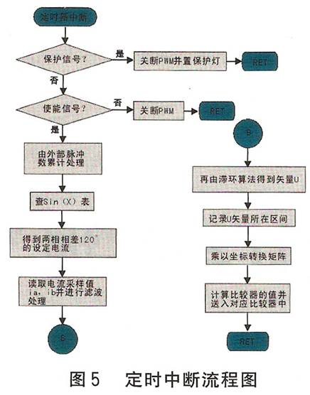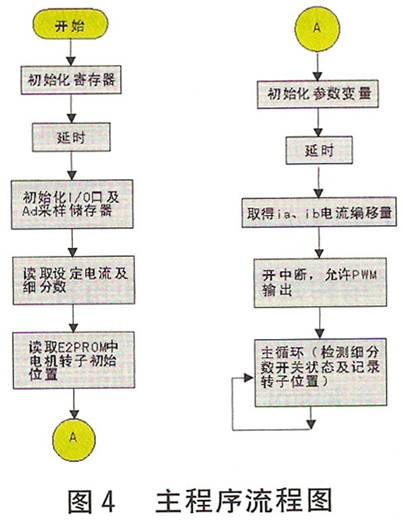 圖4示出主程序流程圖,圖5示出定時(shí)中斷流程圖。為減少功耗和保護(hù)電機(jī),設(shè)置了自動(dòng)半電流功能(靜態(tài)鎖軸或沒(méi)有脈沖輸入時(shí)電流減半),它由滯環(huán)比較器自動(dòng)進(jìn)行調(diào)節(jié)。