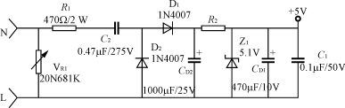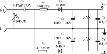 輸入電路的電阻R1(或R1、R2)要采用品質(zhì)較好的金屬膜電阻或水泥電阻,功率2~5W,阻值100~820Ω;降壓電容C2(或C5)采用高質(zhì)量的高壓金屬化聚丙烯電容,一般0.22~0.47μF,耐壓應(yīng)≥AC250V,電容的容量過大會引起視在功率超標(biāo)。