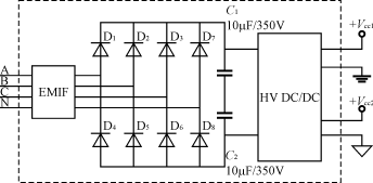 這種供電方式體積和重量較大,成本也較高,顯然按以上電路連接時,對三相四線供電時不能缺零線,對三相三線供電時不能缺公共地線,如B相;另外,有的供電局用戶要求,三相電度表輸入端任意兩線有電壓輸入時都能工作,則圖5的設(shè)計便不能達到目的;當(dāng)采用三相電度表專用開關(guān)電源模塊供電時,可解決以上問題,其內(nèi)部結(jié)構(gòu)圖如圖6所示。