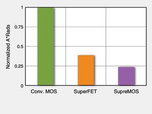 在需要最低RDS(on)與快速切換的應(yīng)用中,新的平衡型器件,例如SupreMOS與SuperFET,可提供最大的優(yōu)勢。一般而言,SuperFET器件在RDS(on)要求為0.5~1Ω之時優(yōu)勢最大。而SuperMOS在RDS(on)低于0.5Ω時優(yōu)勢明顯。這一差異又是由于熱阻的作用。