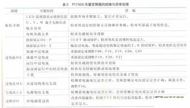 (5)上述調試試驗如有異常,立即查找原因并排除故障PI7000矢量變頻器的故障與異常處理,可見表2