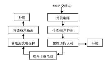 從手機鋰離子二次電池的恒流/恒壓充電控制出發,用220V交流電通過配置的內置儲能鋰電池對手機鋰離子電池充電。電路的具體工作流程如圖1所示。