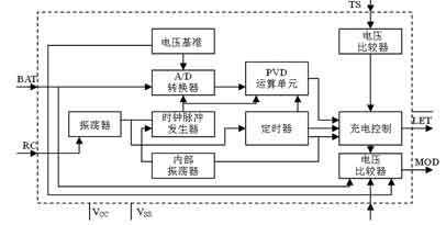 首先,由振蕩器和內部振蕩器共同作用到時鐘脈沖發生器,產生時鐘信號,用來控制D/A轉換、-ΔV運算器及其他有關單元電路,并使之同步工作。該充電芯片在中斷充電電流期間進行采樣,以求采樣的精確。采樣電壓從腳4(BAT)進入電路內部,經A/D轉換后送入-ΔV運算器處理,并將運算結果送入充電控制單元,隨時控制充電過程。