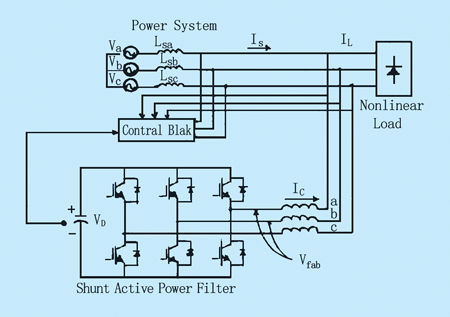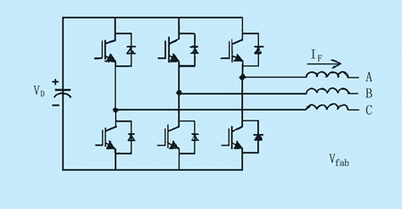 APF是抑制電網諧波和補償無功功率、改善電網供電質量的最有效PE裝置。大多數APF拓撲均利用電壓源逆變器,并通常以電容器作為貯能器件如圖1所示。以適當選通可控的功率半導體開關,把直流電壓變換成交流電壓。雖然,為合成交流電壓能施加每半周的單脈沖,但對大部分應用中要求的動態性能,今天普遍采用的是脈寬調制(PWM)。