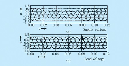 如圖7所示,無源LC濾波器與負荷并聯,串聯型APF的工作如同一臺諧波隔離器,迫使負荷電流諧波主要通過無源濾波器循環,而不經過配電系統。此方案的優點是:串聯APF的額定功率僅為負荷定額(KVA)的一小部分,通常為5%。但在電壓補償時,串聯APF的視在功率定額可能增加。圖8是串聯濾波器為補償負荷側電壓諧波的工作原理圖。串聯APF還可用于抗基波電壓的干擾。圖9所示為電源電壓偶然跌落時串聯APF所起的作用。如圖8所示,負荷電壓幾乎保持恒定,僅在電源電壓跌落的起始和最后瞬間,出現了很小的不穩定和振蕩。
