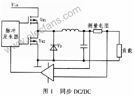 Vin為輸入電壓,VM1、VM2為MOSFET,VM1導(dǎo)通寬度決定輸出電壓大小,快恢復(fù)二極管和VM2共同續(xù)流電路,整流管的導(dǎo)通損耗占據(jù)最主要的部分,因此它的選擇至關(guān)重要,試驗(yàn)中選用通態(tài)電阻很低的M0SFET。電感、電容組成濾波電路。測量電阻兩端電壓與給定值比較后,通過脈沖發(fā)生器產(chǎn)生相應(yīng)的脈寬,保持負(fù)載電流穩(wěn)定。VM1關(guān)斷,快恢復(fù)二極管工作,快恢復(fù)二極管通態(tài)損耗大,VM2接著開通續(xù)流,減少系統(tǒng)損耗。