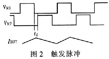 VM1導(dǎo)通ton時(shí),可得:,電流紋波為:;VM1關(guān)斷,電流通過VD續(xù)流,接著VN2導(dǎo)通。由于VM2的阻抗遠(yuǎn)小于二極管阻抗,因此通過VM2續(xù)流。VMl、VN2觸發(fā)脈沖如圖2所示。圖2中td為續(xù)流二極管導(dǎo)通時(shí)間。