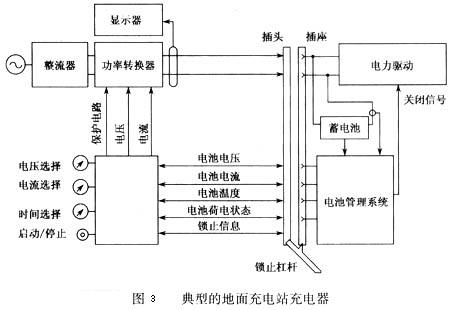 圖3為一典型的地面充電站中充電器的方案,該充電器由一個(gè)能將輸人的交流電轉(zhuǎn)換為直流電的整流器和一個(gè)能調(diào)節(jié)直流電功率的功率轉(zhuǎn)換器組成,通過(guò)把帶電線的插頭插入電動(dòng)汽車上配套的插座中,直流電能就輸入蓄電池對(duì)其充電。充電器設(shè)置了一個(gè)鎖止杠桿以利于插入和取出插頭,同時(shí)杠桿還能提供一個(gè)確定已經(jīng)鎖緊的信號(hào)以確保安全。根據(jù)充電器和車上電池管理系統(tǒng)相互之間的通訊,功率轉(zhuǎn)換器能在線調(diào)節(jié)直流充電功率,而且充電器能顯示充電電壓、充電電流、充電量和充電費(fèi)用等。