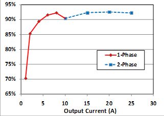 但是,隨著負載的減少,電路進入輕載狀態,開關管的開關損耗逐漸占主導,此時,輸出由一相供電就已經足夠,多相的并聯反而使開關損耗成倍增加。因而,在輕載時,僅留一相工作,關閉多相模式,可以明顯改善電路在輕載時的效率。如圖7所示,為采用ADP1043所設計的交錯式雙管正激電路。當輸出電流值低于通過GUI所設置的閾值時,ADP1043便會關閉QA2、QB2的驅動信號,以減少損耗。圖8所示為采用切相技術的電源的效率曲線,可以發現當輸出電流低于10A時,電源工作在單相模式下,效率有了明顯的提高。