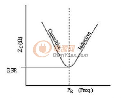 從上圖,我們很清楚的看出:電容在整個頻段,并非都是表現為電容的特性,而是在低頻的情況(諧振頻率以下),表現為電容性的器件,而當頻率增加(超過諧振頻率)的時候,它漸漸的表現為電感性的器件。也就是說它的阻抗隨著頻率的增加先減小后增大,等效阻抗的最小值發生在串聯諧振頻率時,這時候,電容的容抗和感抗正好抵消,表現為阻抗大小恰好等于寄生串聯電阻ESR。