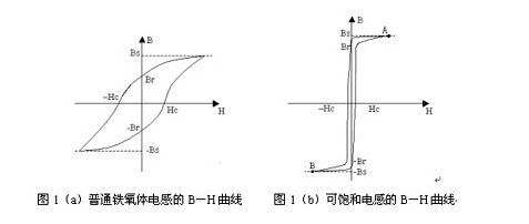 圖1(a)和圖1(b)分別是普通鐵氧體電感和可飽和電感的磁滯回線。從兩者的對比中可以明顯看出可飽和電感具有高磁滯回線矩形比(Br/Bs)、高起始磁導率mi、低矯頑力Hc、明顯的磁飽和點(A,B)等特怔。此外,由圖1(b)還可以看出,可飽和電感的磁滯回線所包圍的面積狹小,所以可飽和電感的高頻磁滯損耗相應也較小。由于可飽和電感通常是由微晶、非晶、坡莫合金等鐵磁性材料制造的,所以可飽和電感一般都具有很高的起始磁導率mi和很高的飽和磁感應