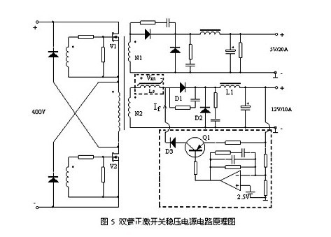 磁放大器穩壓是利用可飽和電感導通延時的物理特性來控制開關電源的占空比和輸出功率,穩定電源輸出電壓的一種方法。在可飽和電感上加上適當的采樣和控制元件,調節其導通延時的時間,就可以構成最常見的磁放大器穩壓電路。圖5是一個輸入為110Vac~220Vac/50HZ,輸出為5Vdc/20A,12Vdc/10A的雙管正激開關穩壓電源,其中5V是主控回路。其輔路12V輸出電流較大,對穩壓精度和負載穩定度都有較高要求,采用普通的方法穩壓效果都不是很理想,如果采用磁放大器穩壓技術就可圓滿解決這一問題,使穩壓電路的結構簡單,耗散功率小,并可達到毫伏級的穩壓精度。