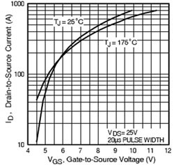 在MOSFET的數據表中,通常可以找到它的典型的傳輸特性。注意到25℃和175℃兩條曲線有一個交點,此交點對應著相應的VGS電壓和ID電流值。若稱這個交點的VGS為轉折電壓,可以看到:在VGS轉折電壓的左下部分曲線,VGS電壓一定時,溫度越高,所流過的電流越大,溫度和電流形成正反饋,即MOSFET的RDS(ON)為負溫度系數,可以將這個區域稱為RDS(ON)的負溫度系數區域。