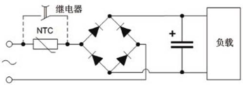 假設(shè)輸入電壓V1為220Vac,整個電網(wǎng)內(nèi)阻(含整流橋和濾波電容)Rs=1Ω,若正好在電源輸入波形達到90度相位的時候開機,那么開機瞬間浪涌電流的峰值將達到I=220×1.414/1=311(A)。這個浪涌電流雖然時間很短,但如果不加以抑制,會減短輸入電容和整流橋的壽命,還可能造成輸入電源電壓的降低,讓使用同一輸入電源的其它動力設(shè)備瞬間掉電,對臨近設(shè)備的正常工作產(chǎn)生干擾。