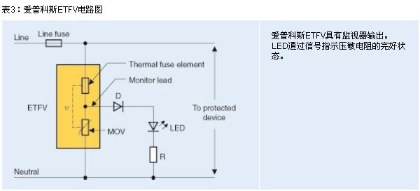 為使太陽能逆變器制造商以低成本滿足各大標(biāo)準(zhǔn)及保險(xiǎn)公司的嚴(yán)格要求,TDK-EPC現(xiàn)開發(fā)出 ETFV系列(愛普科斯熱熔式壓敏電阻)。這些組件通過串聯(lián)電路組合在一起,包括一個壓敏電阻和一個熱熔絲。如果壓敏電阻已嚴(yán)重退化,并致使較高漏電流導(dǎo)致過熱,熔絲將熔斷以斷開壓敏電阻。上述元件的一大特色便是監(jiān)視引線:通過延伸壓敏電阻與熱熔絲之間的觸點(diǎn)以驅(qū)動LED(參見圖3)。