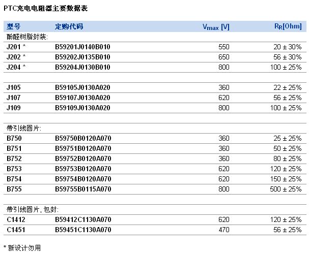 普通電阻在電容充電時(shí)常用來(lái)限制電流。不過(guò),這常有技術(shù)風(fēng)險(xiǎn)。舉例來(lái)說(shuō),當(dāng)短接電容器時(shí),如果電容器短路或者繼電器失靈,電阻器將持續(xù)暴露在大功率電平下。這可能導(dǎo)致電阻器或者整個(gè)系統(tǒng)遭到破壞。愛(ài)普科斯采用基于PTC陶瓷的新式J20X系列充電電阻器,現(xiàn)已研發(fā)出一種專業(yè)解決方案:在自我防護(hù)的同時(shí),還實(shí)現(xiàn)了相對(duì)緊湊的尺寸。如下表所示,J20X系列包括J201、J202和J204產(chǎn)品。