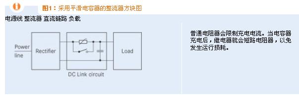 當(dāng)電容器充電時(shí),通常需要串聯(lián)一個(gè)電阻器來(lái)限制充電電流,以免產(chǎn)生超過(guò)允許范圍的強(qiáng)電流峰值。一般是采用固定式普通電阻或負(fù)溫度系數(shù)(NTC)電阻實(shí)現(xiàn)這一功能。在大多數(shù)情況下,會(huì)在充電之后使用一個(gè)由時(shí)間或電壓控制的繼電器來(lái)短接限流元件。充電電流的制約對(duì)整流器和轉(zhuǎn)換器系統(tǒng)來(lái)說(shuō)非常重要,因?yàn)楫a(chǎn)生的沖擊電流峰值如果未得到限制,可能會(huì)觸發(fā)熔絲或使整流器遭受超過(guò)允許范圍的強(qiáng)電流。圖1所示為傳統(tǒng)整流器或轉(zhuǎn)換器系統(tǒng)的方塊圖。