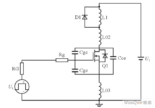 RG+Rg是IGBT的柵極電阻, L01、L02、L03是雜散電感(分布電感), Cgc、Cge、Cce是IGBT的極間電容, U1是驅動控制信號, U2為母線電壓。