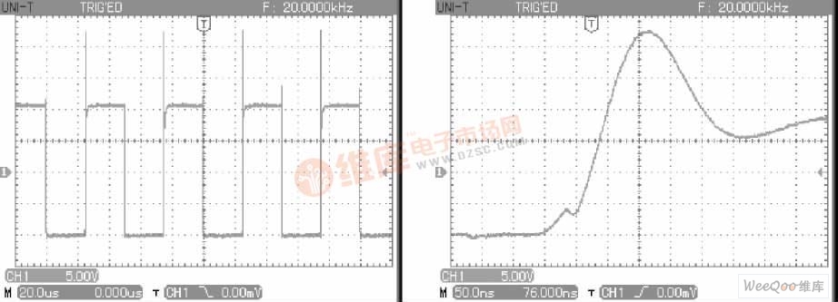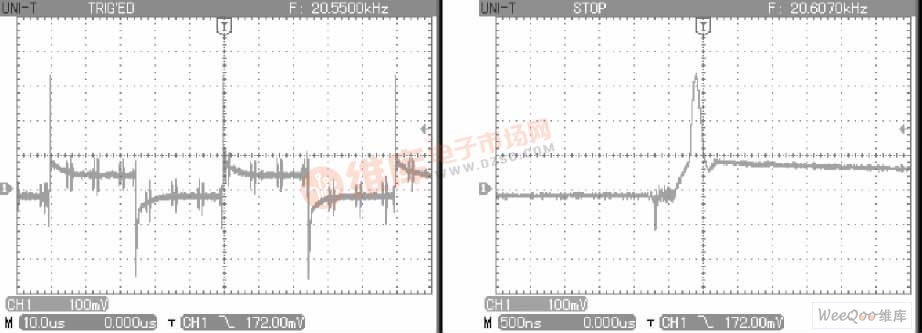另外,開通過程中,由于二極管D1的反向恢復電流IRM將疊加在集電極電流iC上,這也會使IGBT實際流過的電流存在一個尖峰,這一尖峰可通過串聯在回路中的電阻上的電壓波形觀察。