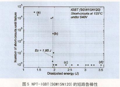 NPT—IGBT的魯棒性見圖5,被測器件是SGW15N120。在540V 125℃時測試。X軸是耗散的能量。Y軸是器件直至損壞的短路周期次數(shù)。