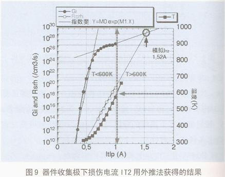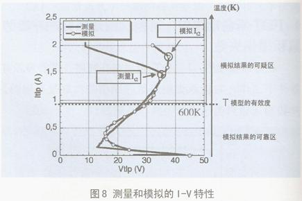 圖8是NPN管測量的和用(2)假定來模擬的I-V特性。由圖8可見,測量的損傷電流IT2=1.5A,而模擬值是1..8A,有較大誤差。