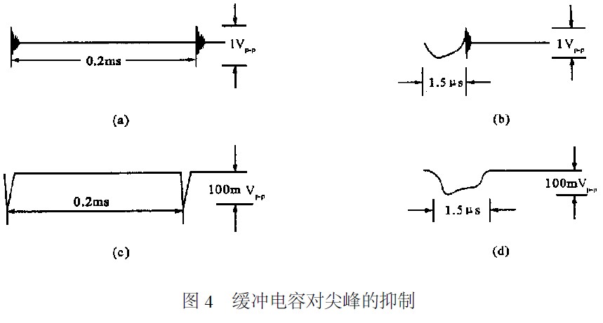 在開關(guān)三極管的CE之間,或者在續(xù)流二極管的兩端并聯(lián)RC緩沖電路可使尖峰干擾明顯減小。圖3中,三極管T關(guān)斷時,集電極電壓上升,通過D和R1對C充電,使其上升速率變緩,選擇充電常數(shù)CR1的值可以控制上升速率。T導(dǎo)通時,D截止,C對R1和R2放電,限制了導(dǎo)通瞬間的峰值電流。該緩沖電路改變了負(fù)載線的形狀,減少了開關(guān)三極管的損耗。在續(xù)流二極管兩端并上RC電路也同樣有效。圖3中,當(dāng)用3DD11和2CK120C時,可并0.022LF左右的電容器(f=2kHz),該電容的容量有一最佳值,它的作用可以從圖4看出。圖4(a)是不加C的情況,將其在時間軸上放大后為圖4(b)。并上緩沖電容后分別見圖4(c)和(d)。