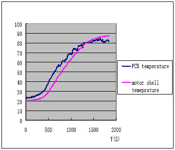 用上文所述的PPTC設(shè)計流程可以用在多功能豆?jié){機(jī)馬達(dá)防堵保護(hù)設(shè)計中,但這是往往會碰到選擇PPTC型號困難的問題,也就是說多功能豆?jié){機(jī)的馬達(dá)保護(hù)設(shè)計會較普通的小家電馬達(dá)保護(hù)復(fù)雜的多,圖4為磨制豆?jié){時PCB板周圍環(huán)境溫度和馬達(dá)外殼溫度的實測圖,可見控制電路PCB板PPTC周圍的環(huán)境溫度最高可以到達(dá)85C。由于豆?jié){機(jī)的PPTC最高環(huán)境溫度85度會比普通的小家電最高環(huán)境溫度要求高,這樣既要在85度的最大工作電流下能正常工作,還要保證在最低溫度0度的堵轉(zhuǎn)電流情況下能及時的保護(hù),相應(yīng)的就增大了設(shè)計難度。下面就具體的闡述此類多功能豆?jié){機(jī)馬達(dá)堵轉(zhuǎn)的保護(hù)設(shè)計方案。