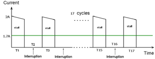 圖6為多功能豆?jié){機(jī)的堵轉(zhuǎn)電流。在榨水果的堵轉(zhuǎn)情況下,實測馬達(dá)的堵轉(zhuǎn)最大電流為2A,由于榨果汁時馬達(dá)也不是一直連續(xù)工作的,也是間隔一定時間工作,間隔時間是馬達(dá)工作6S,停3S,這樣換算成在一個榨水果完整工作周期內(nèi)平均電流是1.6~1.7A。在1.6~1.7A堵轉(zhuǎn)電流下,馬達(dá)堵轉(zhuǎn)需要保護(hù)的時間要求在150S內(nèi)。
