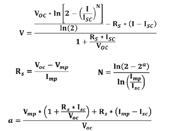 為了能夠精確仿真太陽能電池板在特定環(huán)境條件下的輸出(特別是對于小功率逆變器,仿真精度的要求往往更高),很多廠家推出了專用的太陽能方陣模擬器,用于模擬各種環(huán)境下太陽能電池板的輸出特性,精確地復現(xiàn)出不同環(huán)境條件下的I-V輸出特性曲線。I-V曲線的數(shù)據(jù)多來自于用戶對太陽能電池板輸出的實際測量結果。為了簡化操作,目前國際上通用的曲線設置方式是:通過I-V曲線上的四個特征值,即Voc(開路電壓值)、Isc(短路電流值)、Vmp(最大功率點電壓值)、Imp(最大功率點電流值)來擬合得到完整的I-V曲線。所使用到的公式如下所示: