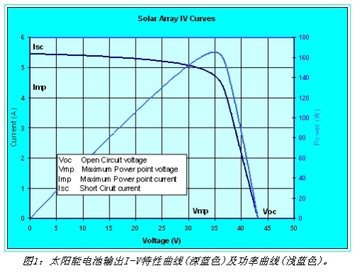 在上述公式的指導下,在太陽能方陣模擬器內部可以精確的建立一條I-V曲線,用來仿真某一特定環(huán)境條件下太陽能電池板的輸出,如圖1所示。無論負載如何改變,太陽能方陣模擬器的工作點將始終位于這條曲線之上。