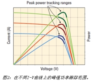 如果目標是為了驗證峰值功率追蹤電路的性能,開發(fā)出能在不同環(huán)境條件下始終工作在I-V曲線最大功率點上的太陽能逆變器,在電路的設計和開發(fā)中就必須考慮峰值功率跟蹤范圍和跟蹤頻率。峰值功率跟蹤范圍是I-V曲線最大峰值功率點附近的一段區(qū)間,這也是逆變器峰值功率跟蹤電路算法的工作區(qū)間,跟蹤頻率則是工作區(qū)間內曲線的擺動速率,如圖2所示。為確保逆變器在模塊I-V曲線變化時始終能夠找到最大峰值功率點,它必須具有足夠寬的跟蹤范圍和足夠高的跟蹤頻率。為驗證設計的有效性,需要根據(jù)精確復現(xiàn)太陽能電池板的I-V曲線來驗證在不同曲線下逆變器能否穩(wěn)定地工作在峰值功率點附近。