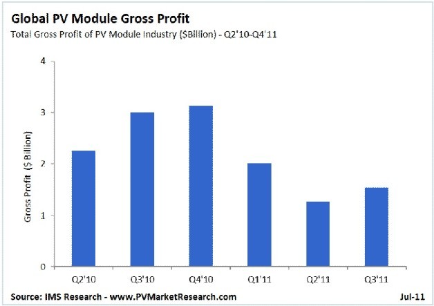 IMS Research的高級市場分析師Sam Wilkinson表示:“做垂直整合的中國一級晶硅光伏組件供應(yīng)商們擁有最具競爭力的成本結(jié)構(gòu),2010年他們的毛利率高達(dá)20%。利潤在2010第三季度到達(dá)最高峰,自那之后開始下降。目前的價格水平對這些供應(yīng)商的利潤造成了巨大的壓力。我們相信到2011年第三季度,他們的平均毛利率將下降到20%以下,而二級供應(yīng)商的利潤甚至?xí)汀?rdquo;2010年,全球光伏組件供應(yīng)商每季度的總毛利率平均約為25億美元,而由于利潤率下降以及出貨量減少,預(yù)計2011年第一季和第二季這個數(shù)字將下降40%。預(yù)計2011年下半年需求將再次回升,這將有助于供應(yīng)商恢復(fù)利潤。IMS Research預(yù)計光伏組件供應(yīng)商的總毛利率在2011年第三季和第四季將再次增長。