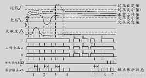 如工作電壓超出其欠壓設(shè)定值時,吸合工作觸點進(jìn)入所設(shè)定的延時保護(hù)狀態(tài)(設(shè)定時間為0~30s)。待延時結(jié)束后,控制器工作觸點釋放,由接通狀態(tài)變至斷開狀態(tài),直至電壓重新回至正常電壓工作帶。在工作時序圖中,保護(hù)觸點狀態(tài)2、3即為欠壓保護(hù)工作狀態(tài)。