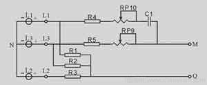 在保護(hù)器電源輸入端⑤、⑥、⑦串接相應(yīng)的RC移相電路(R4、RP9、C11、RP10、R5、R3)。調(diào)整相應(yīng)電位器RP9、RP10,使加至整流橋輸入端M、Q的電壓為確定值(在保護(hù)器工作電源處于額定電壓下進(jìn)行調(diào)整)。如工作電壓有波動,則由相應(yīng)RC移相電路使整流橋電壓輸入端電壓發(fā)生變化,從而使IC3A②端電壓Vcc也發(fā)生變化。在取樣電路中加入V1穩(wěn)壓管,則保證電壓檢測值不得超過V1穩(wěn)壓值。如超出,則IC3A中V③<V②,輸出①端為“0”,并使IC3B⑤端電平為“0”(C6經(jīng)R28放電,電平下降);同時,IC3B輸入端V⑤<V⑥(V⑥電平由R24、R23分壓取得),輸出端⑦亦為“0”,使IC2⑥端電平為“0”,產(chǎn)品處于保護(hù)狀態(tài)。