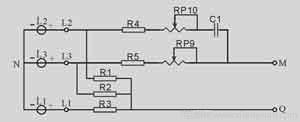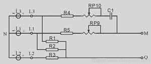 在保護(hù)器電壓處于正常工作帶時,且工作電源端所加電壓相序(L1、L2、L3)為正相序,工作保護(hù)觸點吸合。如L1電壓呈斷相狀態(tài)時,則其余兩相呈過壓狀態(tài),保護(hù)器也隨之進(jìn)入保護(hù)狀態(tài)。當(dāng)L1相又重新恢復(fù)供電,且加入電壓的L1、L2、L3都在其規(guī)定的正常工作帶范圍內(nèi)時,保護(hù)觸點6又重新開始吸合工作。當(dāng)加入工作電源輸入端由L1、L2、L3變?yōu)長2、L1、L3或L3、L2、L1時,因相序發(fā)生變化,保護(hù)器的保護(hù)觸點都呈釋放斷開狀態(tài),無保護(hù)功能。