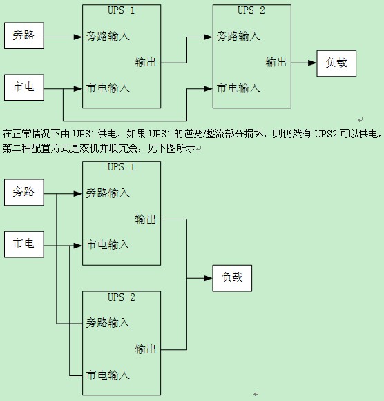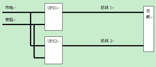對(duì)于一般的UPS系統(tǒng)應(yīng)用來(lái)說(shuō),存在兩種常見(jiàn)的配置方式,一種是雙機(jī)熱備份,見(jiàn)下圖所示
